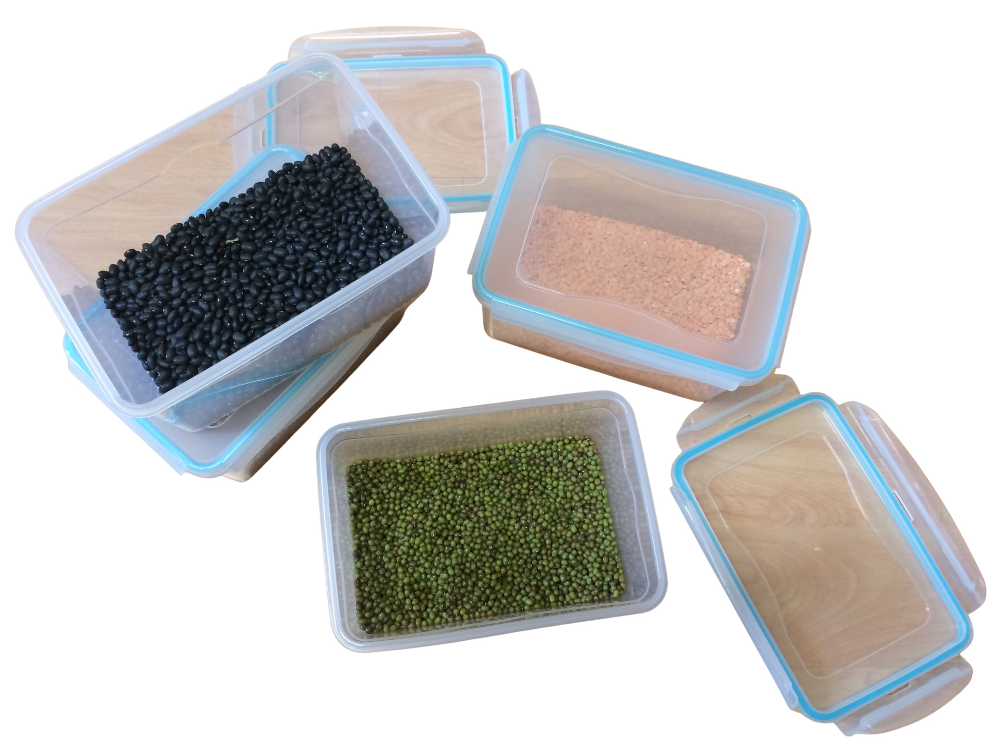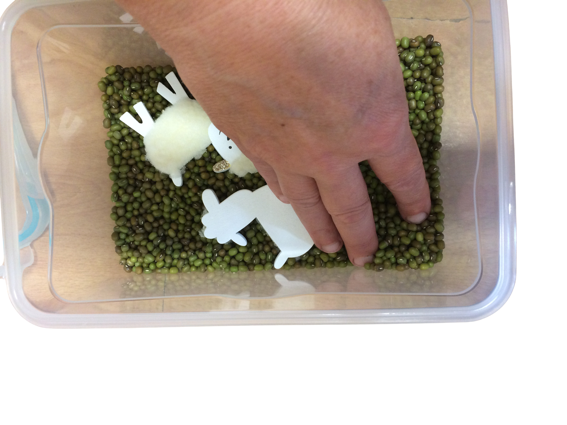 Sada obsahuje jeden veľký box, v ktorom je umiestnených 8 menších boxov s rôznym obsahom - strukoviny, cestoviny, ryža, piesok, zrno, kamienky.