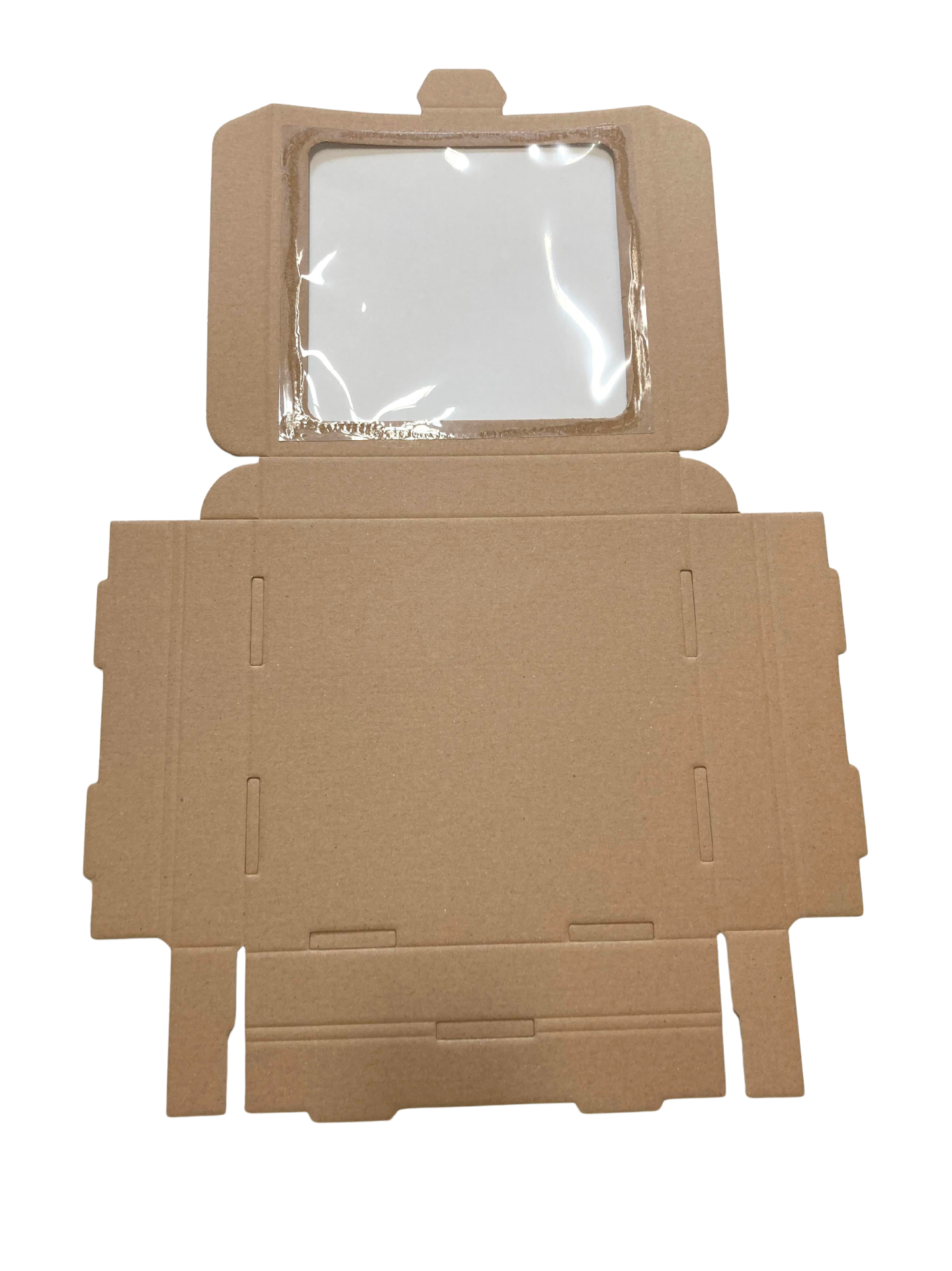 Krabička z vlnitej 3-vrstvovej lepenky vyrábaná strojovo. Okienko je podlepené transparentnou (priehľadnou) fóliou. Pevnosť podporuje zasúvací klop, vďaka ktorému je krabička pevne uzatvorená. Je dodávaná v rozloženom stave.