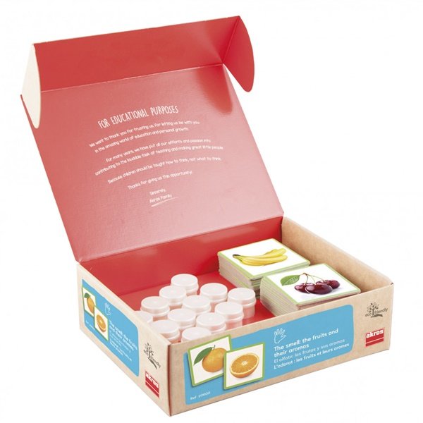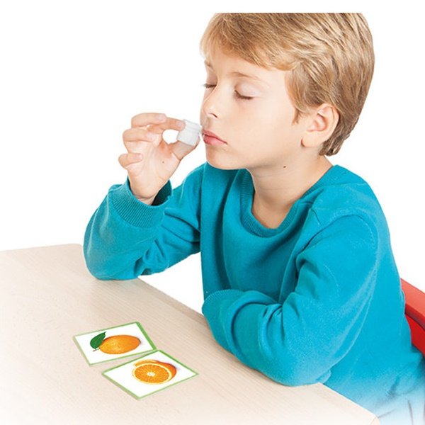 Edukačná zmyslová hra "Vôňa ovocia" je určená na rozvoj čuchu, identifikovaním vôní rôznych druhov ovocia. Úlohou je priradiť vôňu k fotografiám konkrétneho ovocia. Priradenie reálnych fotografií ovocia (vcelku a rozkrájaného) k správnej vôni, umožní vybudovať zrakovo-čuchové asociácie. Hra rozširuje aj slovnú zásobu a naučí deti rozlišovať tvary a farby. Na zadných stranách kartičiek a spodnej strane fľaštičky je samokontrolný opravný systém.